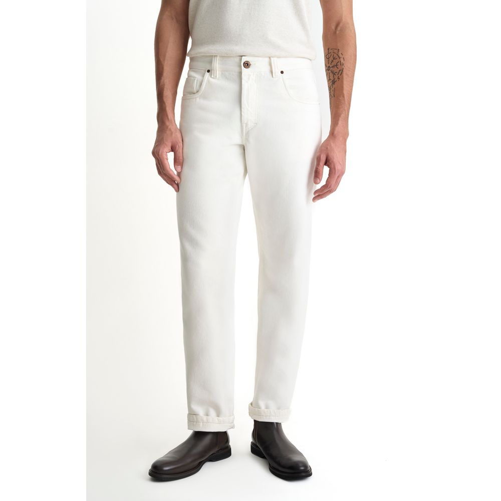 O jeans branco da linha Vintage Denim traz uma leitura minimalista do raw denim — tecido 100% algodão, estrutura firme e aparência limpa, que se transforma com o tempo e o uso. Com peso aproximado de 12 oz, oferece presença e durabilidade, enquanto a modelagem reta relaxed traz equilíbrio entre conforto e estilo clássico.