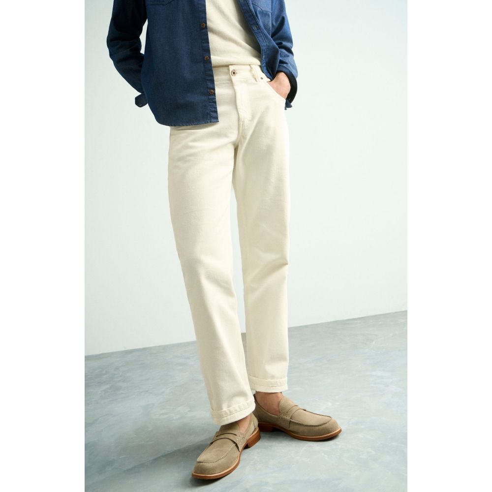 O jeans branco da linha Vintage Denim traz uma leitura minimalista do raw denim — tecido 100% algodão, estrutura firme e aparência limpa, que se transforma com o tempo e o uso. Com peso aproximado de 12 oz, oferece presença e durabilidade, enquanto a modelagem reta relaxed traz equilíbrio entre conforto e estilo clássico.