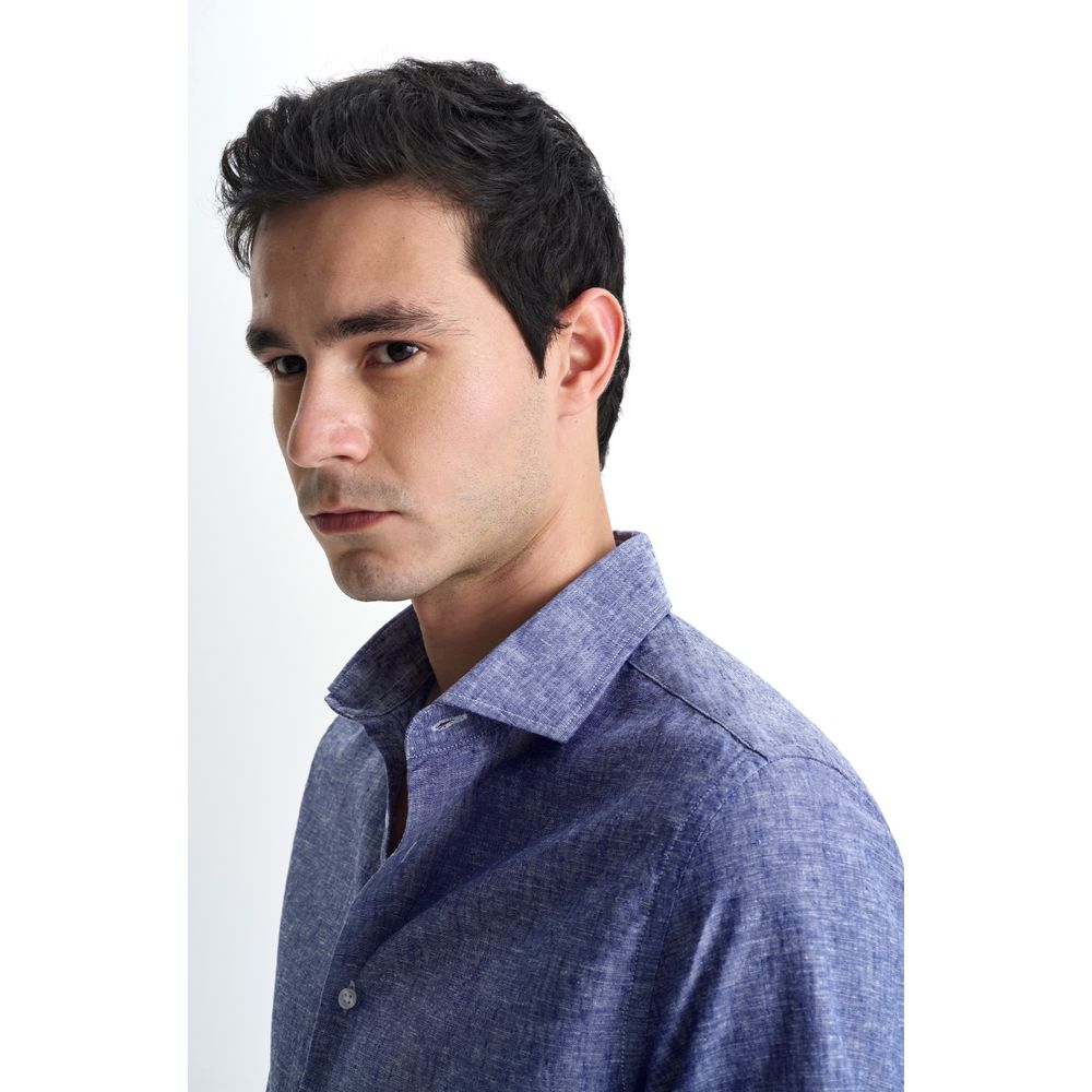 Essa camisa casual manga curta é produzida com tecido misto de linho com algodão, trazendo bastante conforto térmico e toque de tear mais rústico, remetendo às tecelagens manuais. A modelagem é a custom fit, básica e com excelente caimento. O colarinho é clássico e possui bordado do logotipo no interno da vista, proximo à barra. Composição textil: 55% linho, 45% Algodão