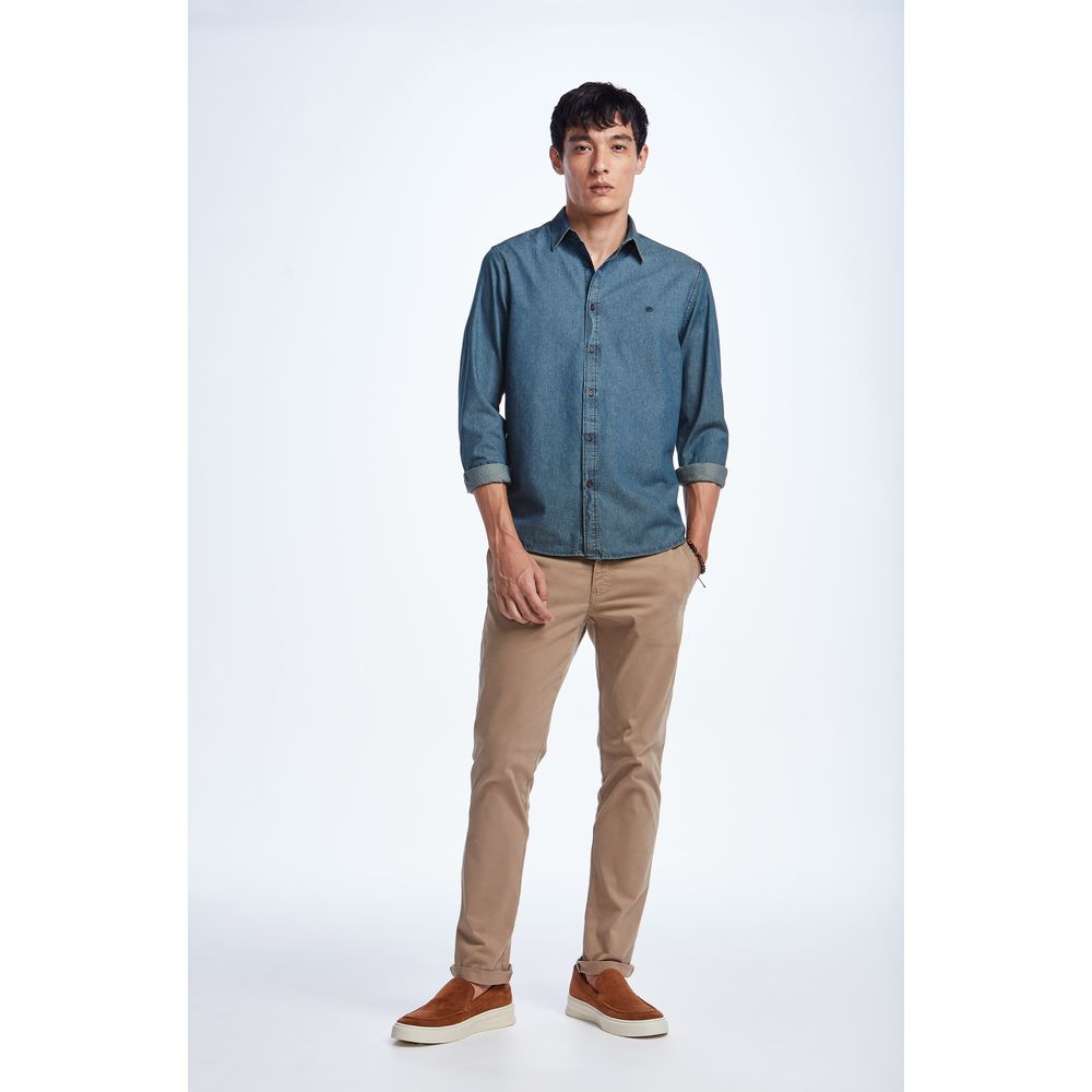 Essa camisa casual jeans é produzida em tecido de algodão indigo, em lavagem estonada, modelagem custom fit (básica) com colarinho clássico e barbatanas internas removíveis. Possui a vista aplicada e bordado do logotipo da marca aplicado na altura do peito.