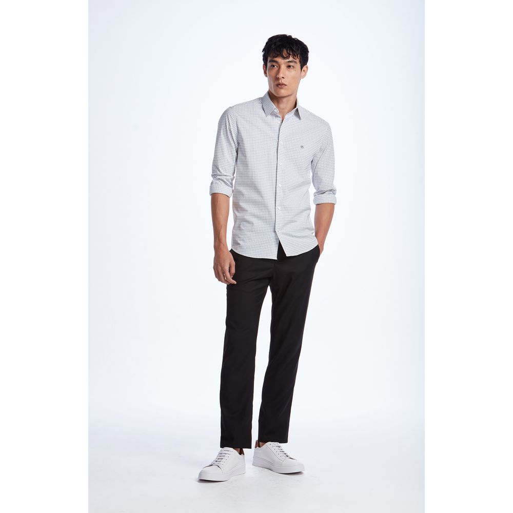 Essa camisa work é produzida com tecido de algodão com elastano, em fios tintos com desenho xadrez na cor grafite em fundo branco. Possui colarinho clássico com barbatanas internas removíveis nas pontas de gola e bordado do logo da marca no peito. A modelagem é a custom fit, básica. É uma camisa leve e com o conforto do stretch.
