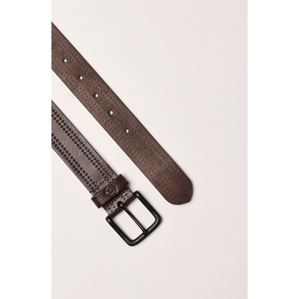 Cinto em soleta de couro legítimo na cor marrom café, estilo casual, com detalhes de pespontos em toda sua extensão, gravação do logotipo da Vila Romana em queima de baixo relevo, fivela de metal pintado na cor preta em acabamento fosco.